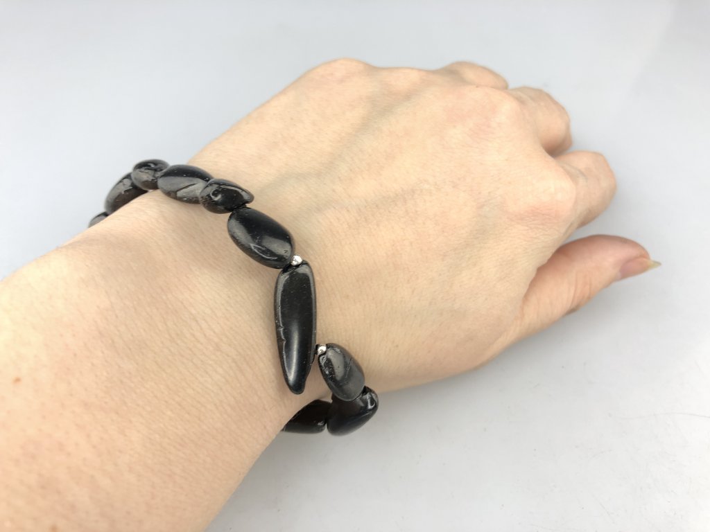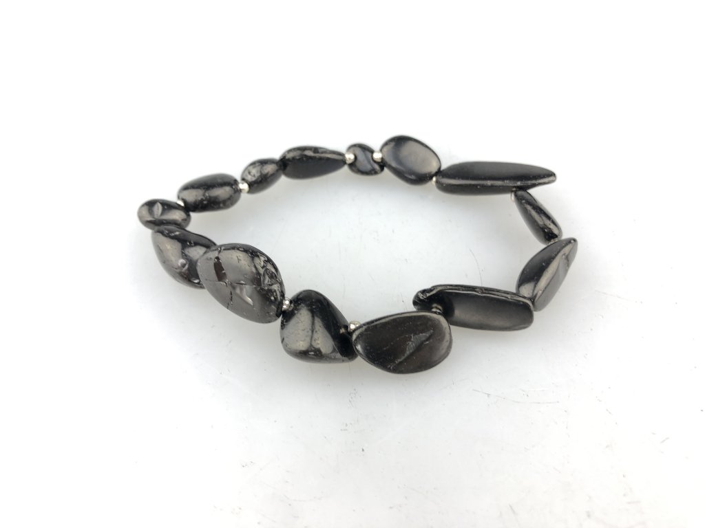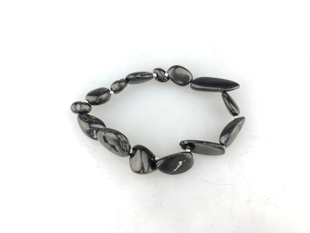 Šungit je navlečený na gumičku, stříbrné komponenty jsou z rhodiovaného stříbra (pokovení rhodiem slouží k ochraně stříbra před černáním). Celková váha stříbrných komponentu je menší než 3 g.