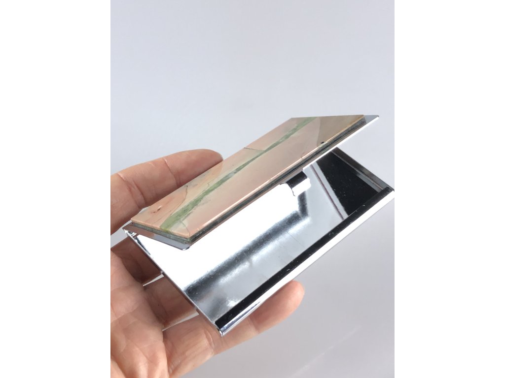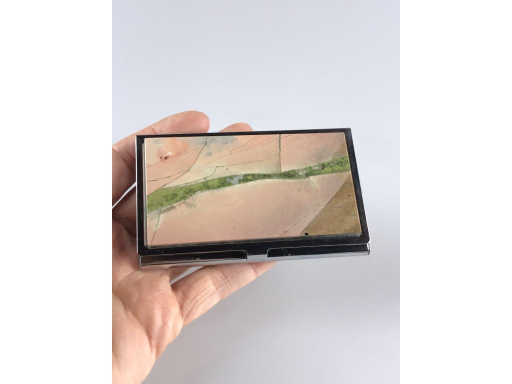 Celokovové pouzdro na vizitky s plátkem vyleštěného jaspisu.