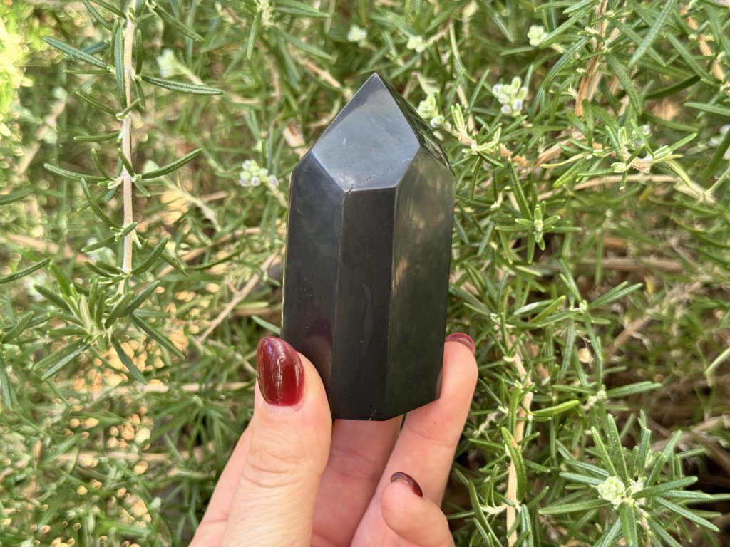 Šungit vybroušený a vyleštěný do tvaru krystalu.