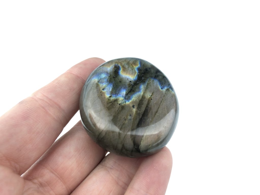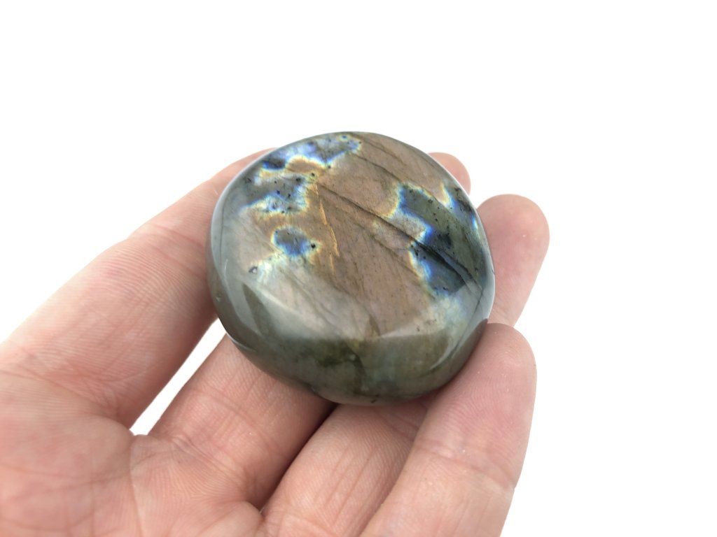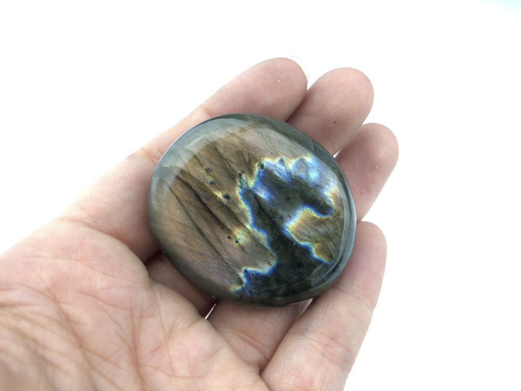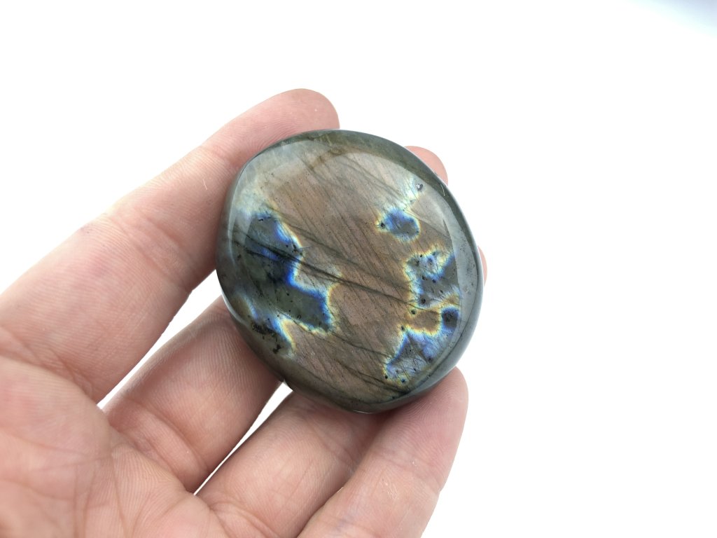 Výběrový labradorit z Madagaskaru. Barvoměna je vidět na obou dvou stranách oblazku.