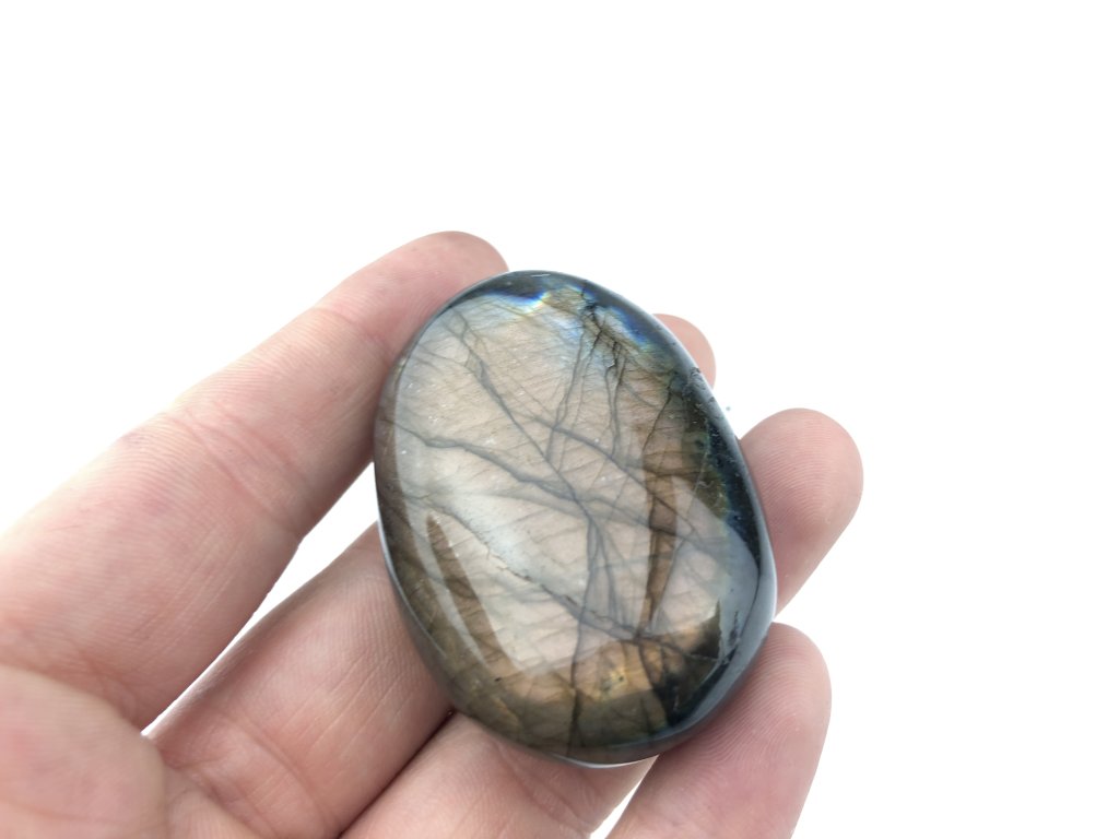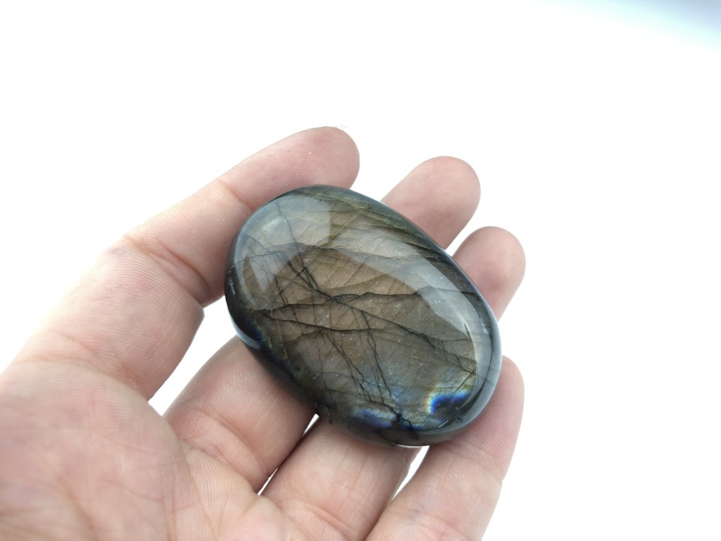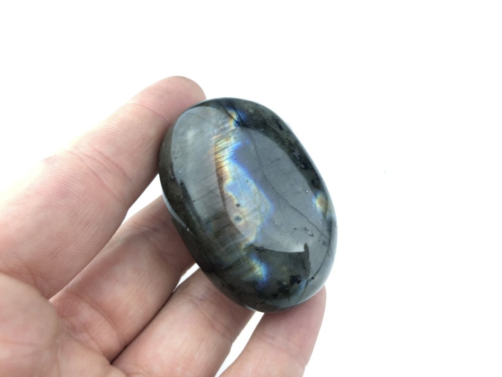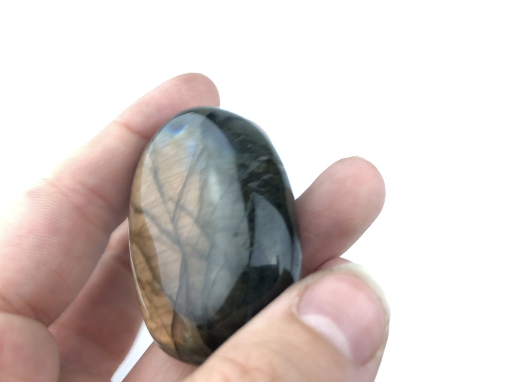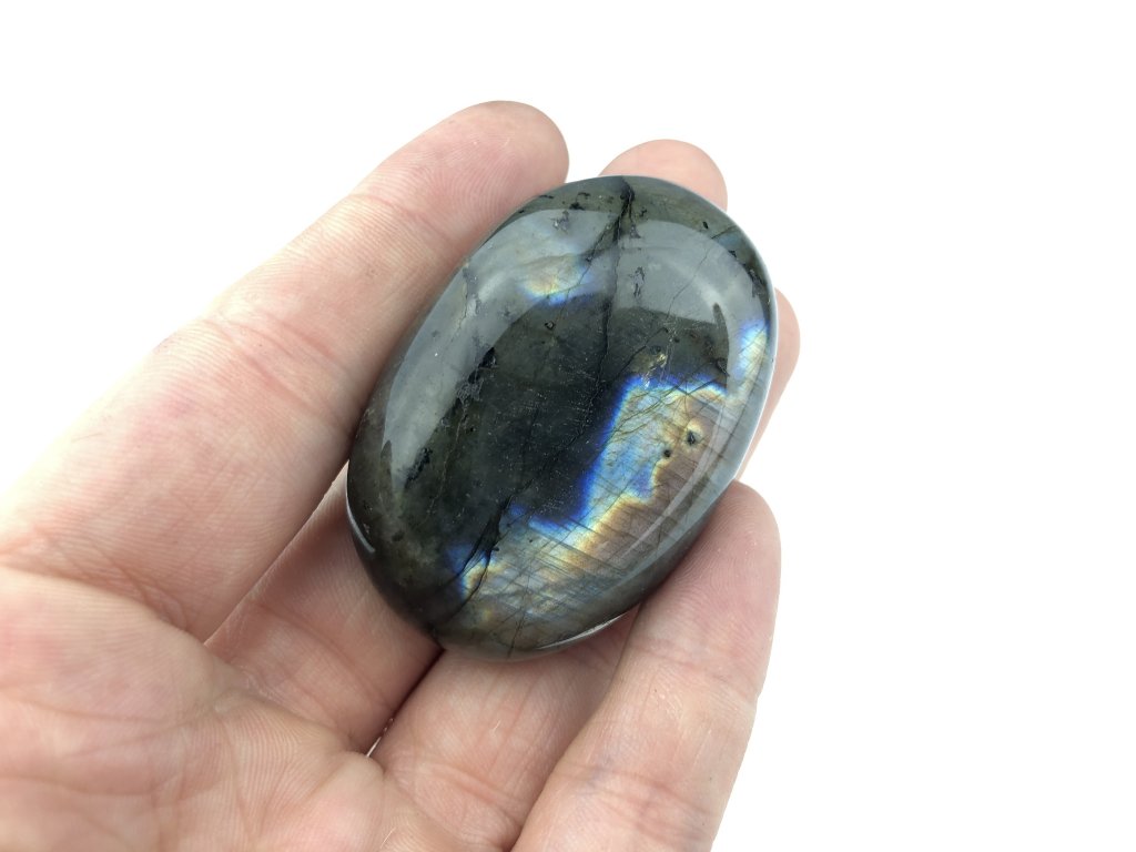 Výběrový labradorit z Madagaskaru. Barvoměna je vidět na obou dvou stranách oblazku.