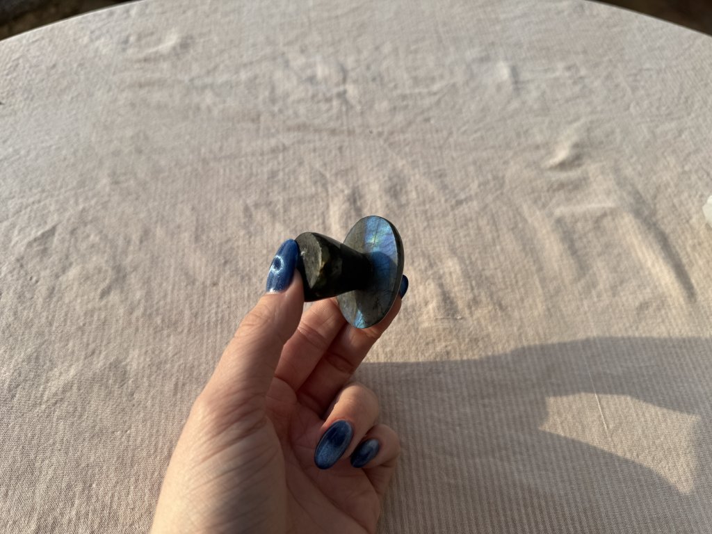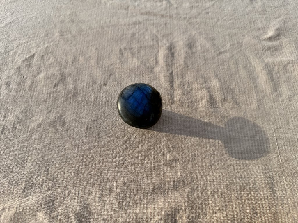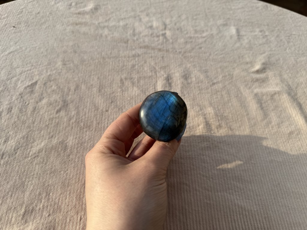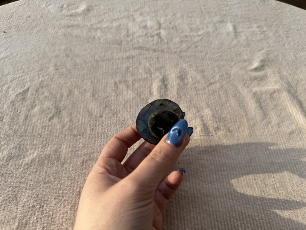 Labradoritová houba extra kvality. Barvo měna: světle modrá, tmavě modrá, žlutá a jemný nádech fialové. Houba mění barvu s obou stran.