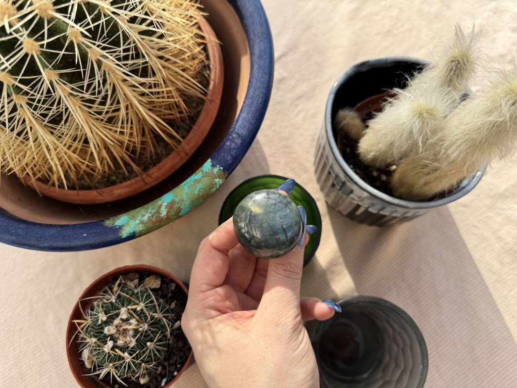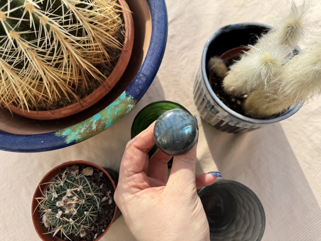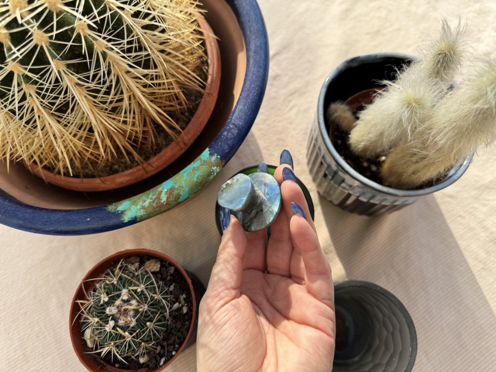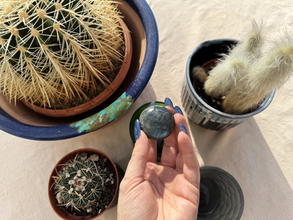Labradoritová houba extra kvality. Barvo měna: světle modrá, žlutá, oranžová nádech fialové. Houba mění barvu s obou stran.