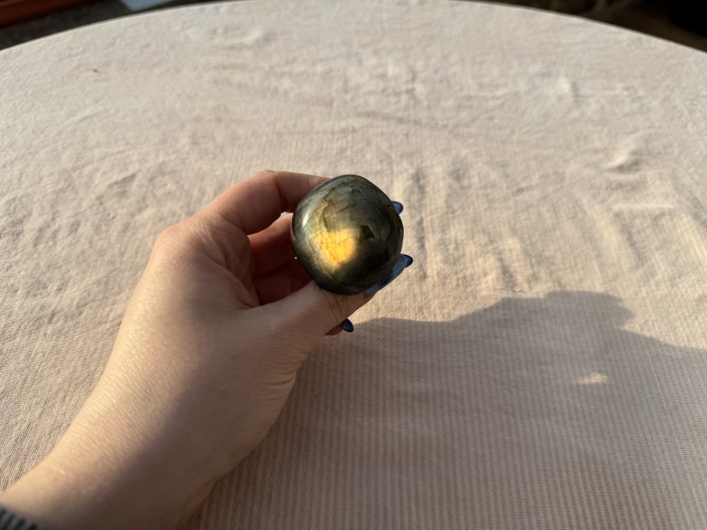 Labradoritová houba extra kvality. Barvo měna: žlutá, oranžová, modrá a lehký nádech fialové. Houba mění barvu s obou stran.