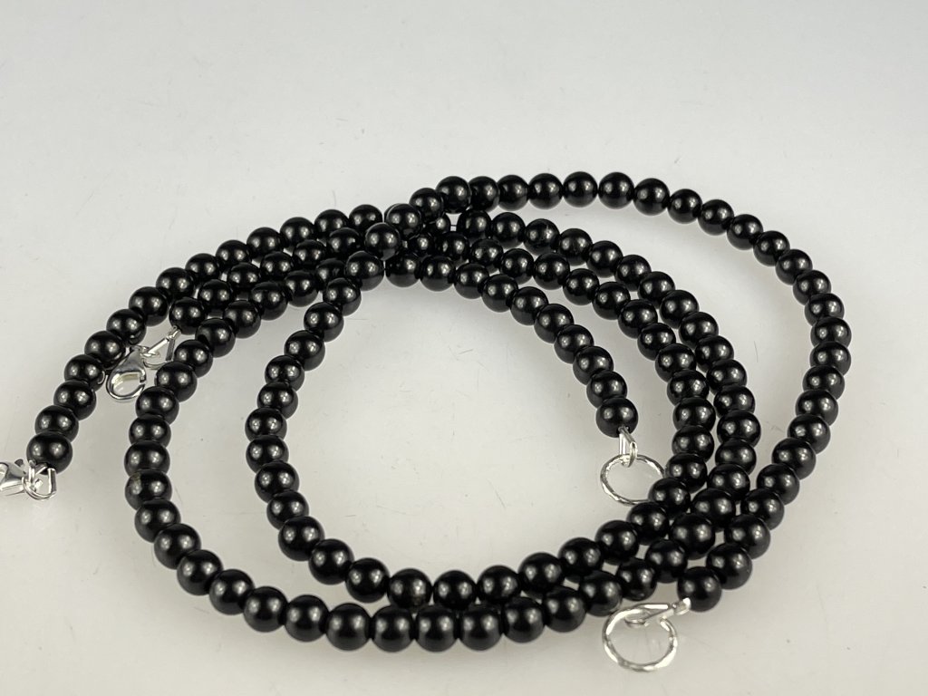 Šungitlové kuličky o průměru 6 mm navlečené na ocelové pogumované lanko, stříbrný zámek a komponenty. Celková váha stříbra je menší než 3 g.
