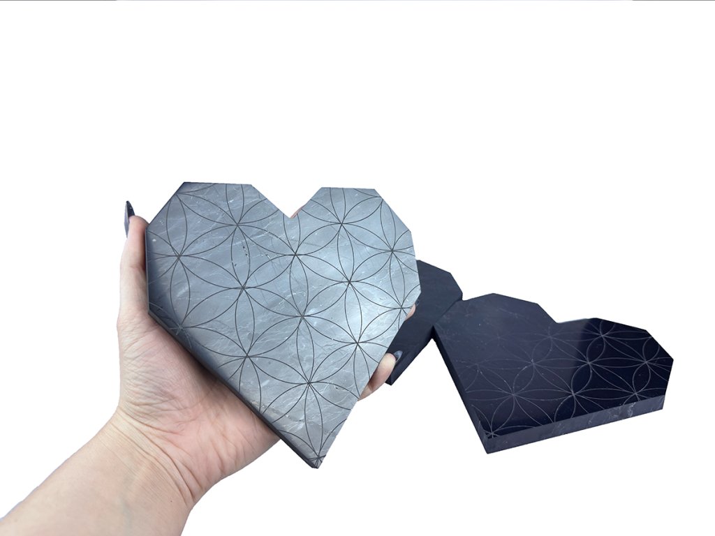 Deska ze šungitu ve tvaru srdce a s vyřezaným květem života. Desku je možné užívat jakožto dekorativní nebo odkladovou desku pro šperky či jiné kameny.
