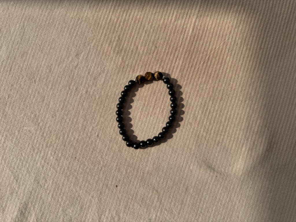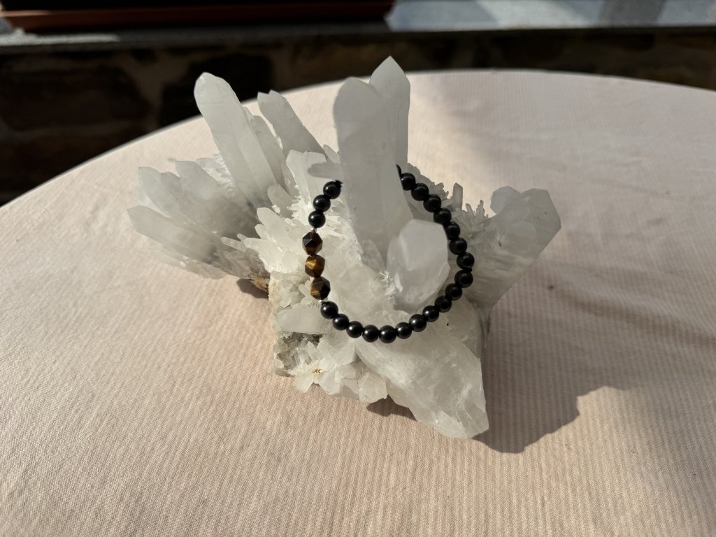 Náramek obsahuje 28 korálků a je navlečen na gumičku a obsahuje několik stříbrných kuliček. Z toho 25 kuliček z šungitu a 3 tygří oka.