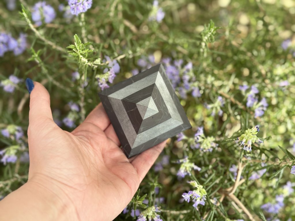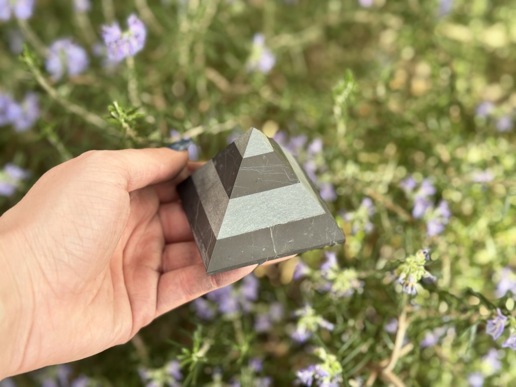 Vyřezávaná pyramida ze šungitu s vědomě přidanými pruhy talkochloritu. Spojení těchto kamenů symbolizuje ochranu, stabilitu a harmonizaci energie. Tvar pyramidy vychází z posvátné geometrie starověkého Egypta a odkazuje na faraonovo žezlo – znak vnitřní síly, řádu a rovnováhy.