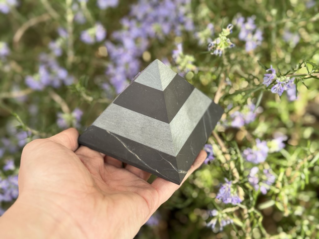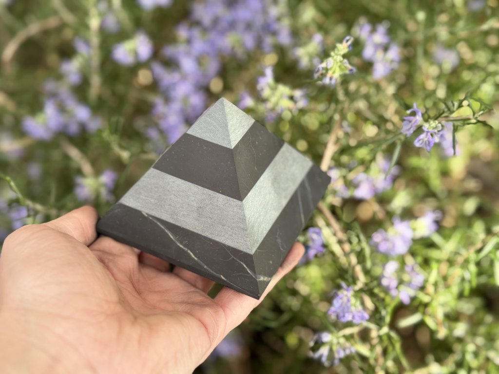 Vyřezávaná pyramida ze šungitu s vědomě přidanými pruhy talkochloritu. Spojení těchto kamenů symbolizuje ochranu, stabilitu a harmonizaci energie. Tvar pyramidy vychází z posvátné geometrie starověkého Egypta a odkazuje na faraonovo žezlo – znak vnitřní síly, řádu a rovnováhy.